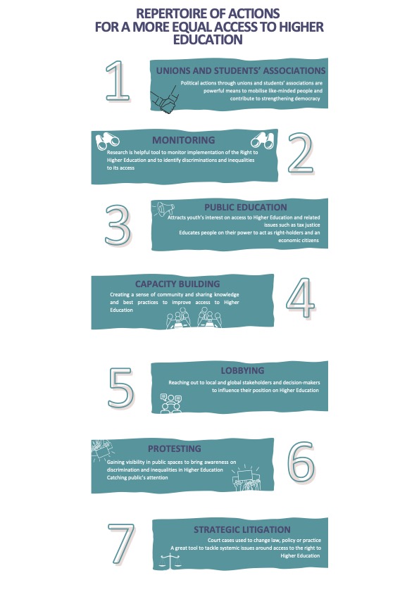Despite challenges such as a limited understanding of complex structural barriers, a myriad of biases like ageism, sexism, racism, or ableism creating obstacles to equal access to education, in addition to unpredictable external factors impacting research and advocacy work, student activists share powerful avenues for action. Training and capacity building, advocating for democratic conversations focused on citizenship regardless of age, and reclaiming agency in the classroom are crucial strategies. Additionally, using proxies for unreliable data or data difficult to find can be a great method. When confronted with unexpected changes, finding new spaces to present work, advocate, and share information might be a creative solution. We believe that these approaches can be a valuable support for student activists to ignite change, amplify voices, and foster tangible progress toward more inclusive and accessible higher education.